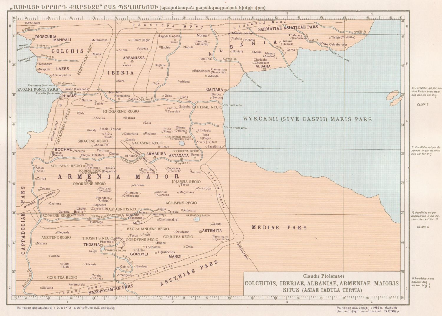 Կլավդիոս Պտղոմեոսի Մ.Թ. 90-168 Ասիայի քարտեզի մի մասը , որը վերաբերում է Հայաստանին: Քարտեզի այս հատվածը իր մեջ ներառում է նաև Կողքիսը, Իբերիան և Աղվանքը Հայաստանի (Մեծ Հայք) հետ միասին: Քարտեզը հրապարակվել է հավանաբար Մ.Թ. 150-ականներին: